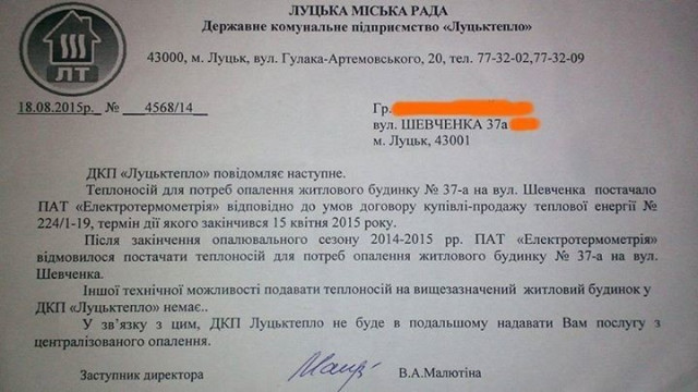 Термін дії договору з ПАТ «Електротермометрія» щодо купівлі-продажу теплової енергії для потреб опалення будинку закінчився ще 15 квітня. У зв’язку з цим, ДКП «Луцьктепло» не зможе надавати будинку послуг з централізованого опалення.