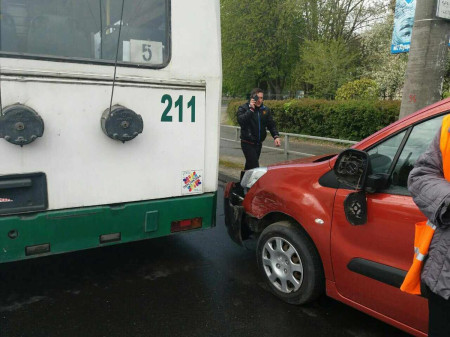 Як видно на фото, Пежо "наздогнало" тролейбус. Пошкоджена передня ліва частина легковика.