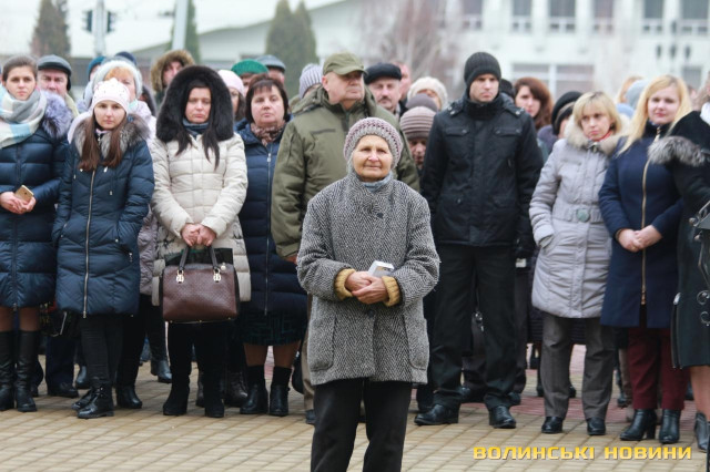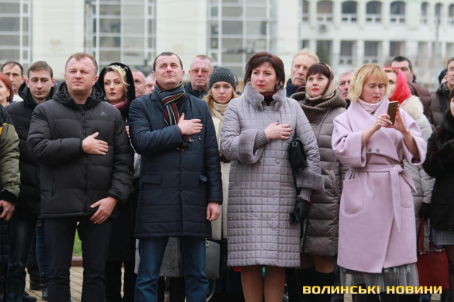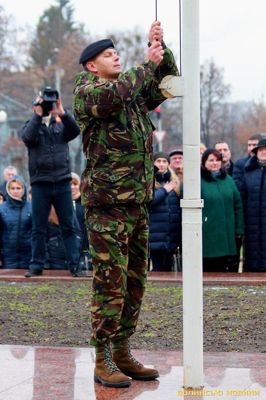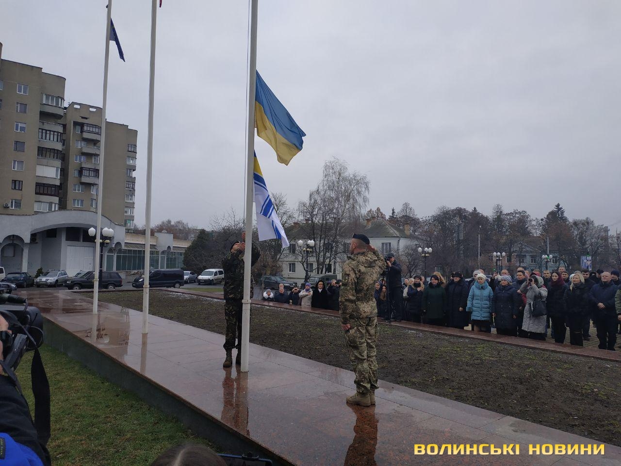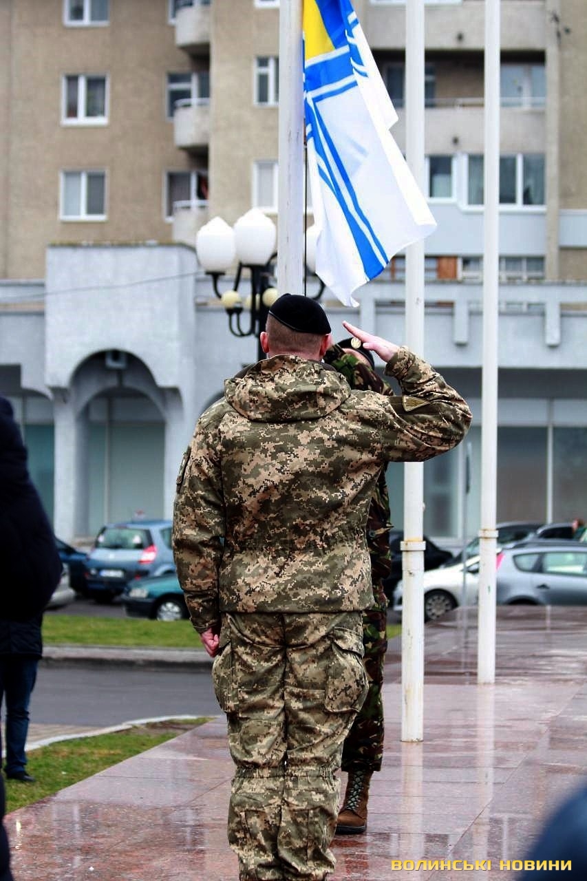 В урочистому піднятті прапора військово-морських сил України взяли участь голова облдержадміністрації Олександр Савченко, учасники антитерористичної операції, працівники ОДА та небайдужі лучани, які прийшли, аби підтримати моряків, над якими триває суд у Російській Федерації.«Коли далеко від фронту, то інакше сприймаєш події, сприйняття уповільнюється. І якщо раніше Росія говорила, що вона ні при чому, то зараз весь світ побачив, що це не так. Адже 25 листопада Російська Федерація відкрито здійснила збройний напад на українські кораблі. Наші моряки у тих умовах діяли, як і всі патріоти: з честю і гідністю. Так само гордо вони повернуться з полону і ми проведемо з ними парад, але це буде не сьогодні і, мабуть, не завтра», - наголосив голова Волинської ОДА Олександр Савченко. Та окремо подякував волонтерам із числа святих отців за те, що вони допомагають патріотам і духовно їх підтримують.Старший сержант, військовий піхотинець Анатолій Горун отримав право на підняття прапора.Зауважимо, аналогічні заходи відбулися у кожному районному центрі області. До слова, до акції могли долучатися усі охочі.