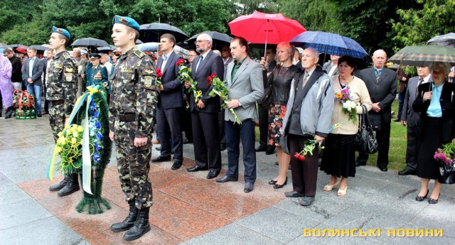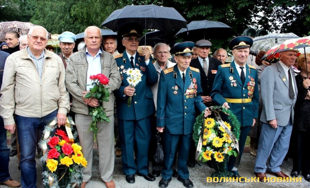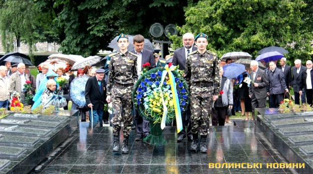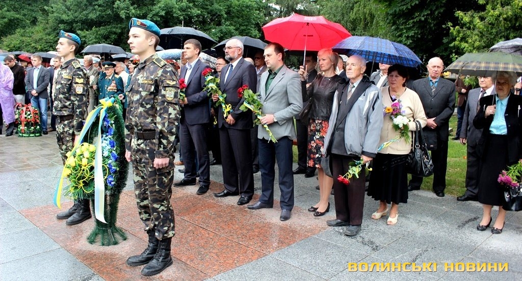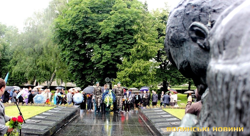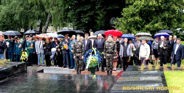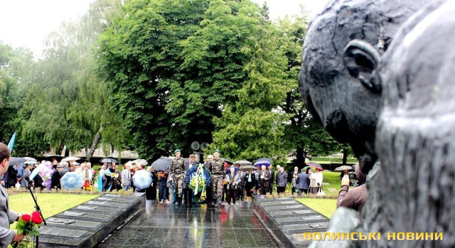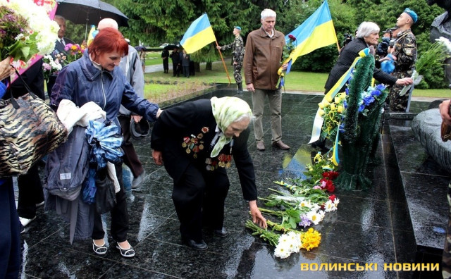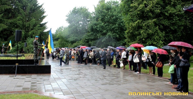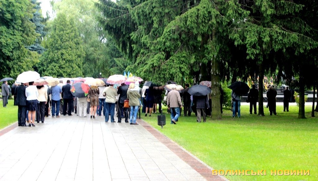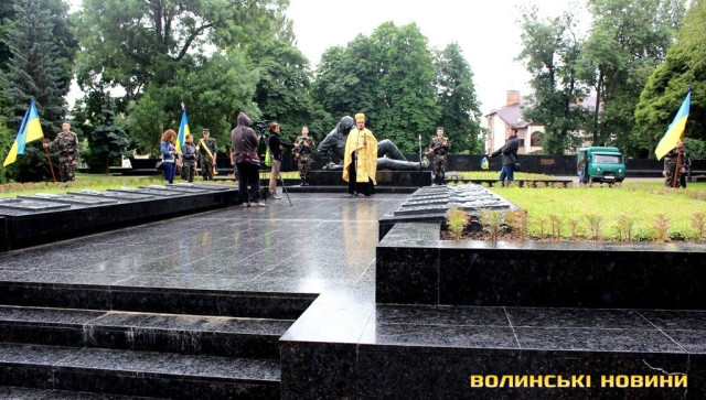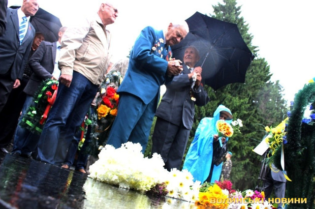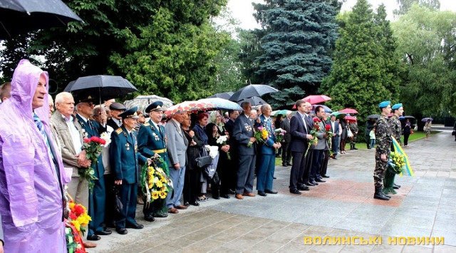 Більше сотні людей прийшли на меморіальний комплекс «Вічна Слава», аби віддати шану й помолитися за упокій душ вбитих українських військових. Разом з волинянами гіркоту спогадів омив сильний дощ, який розпочався раптово.