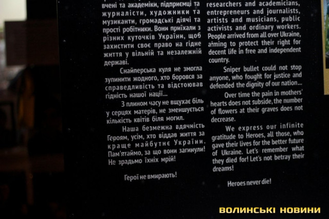 " Микола Романюк наголосив, що це – лише фотостенд, а меморіальну стелу героїв Небесної Сотні із викарбуваними на ній іменами загиблих волинян встановлять на меморіалі поблизу могили Василя Мойсея.