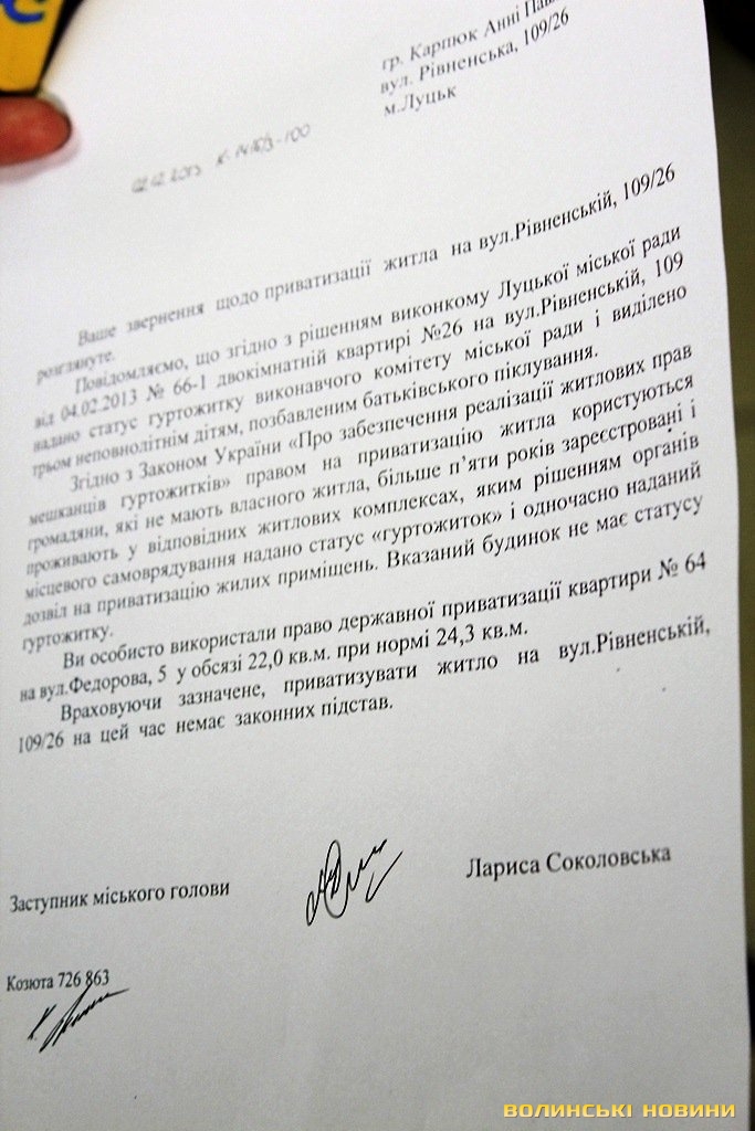 Лучанка Анна Карп’юк скаржиться, що не може приватизувати квартиру у цьому будинку, оскільки приміщення має статус гуртожитка.