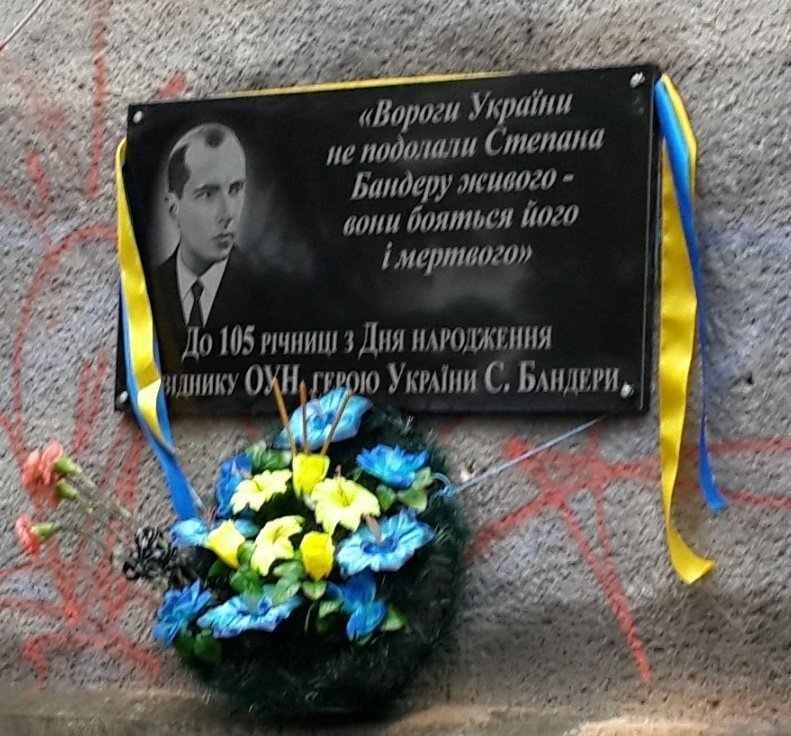 а чому тут дивуватися? яка влада, така й молитва. це ганьба, ліпити на обмальовану стіну вивіску навіть улюбленого свого вождя. ганьба розказувати про бандеру, не знаючи справжніх ідейних засад цього лідера (особливо грамотна в ідеології націоналізму пані ганейчук ), ганьба ще й владі лізти туди і брати слово (все-таки романюк далекоглядніший від пирожиків, бо нікого на те "відкриття" не послав і сам не пішов). а про грамоту напису я вже й не кажу. зато патрійоти!!!!!!!!!!