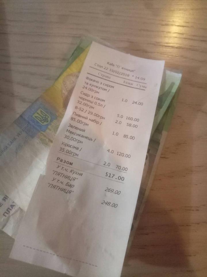 З фото чека видно, що хлопець з дівчиною “посиділи” в закладі на кругленьку суму, а гроші, які вони заплатили – сувенірні. З власних джерел виданню "Під прицілом" стало відомо, що молодика, який розплатився сувенірами, звуть Дмитро Б.