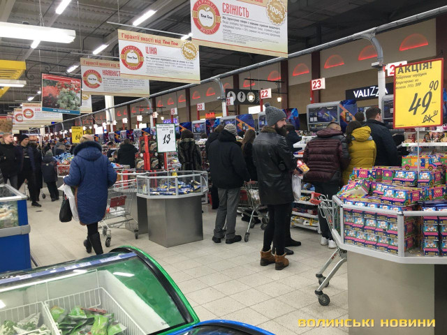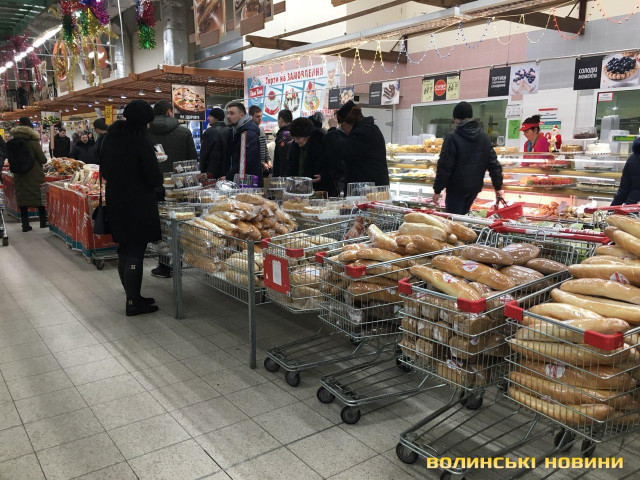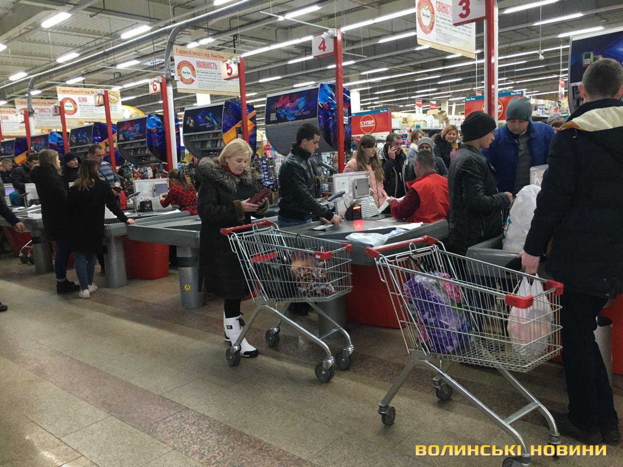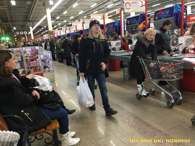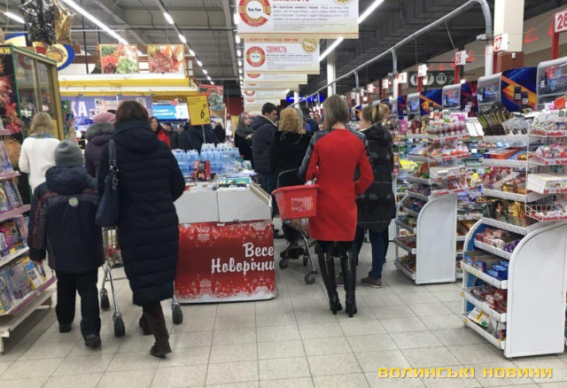 Незважаючи на те, що до настання Нового року залишаються лічені години, лучани заполонили супермаркети й досі блукають у пошуках записаних до списку продуктів, подарунків та іншої новорічної атрибутики, готуючись відстоювати тривалі черги на касах.