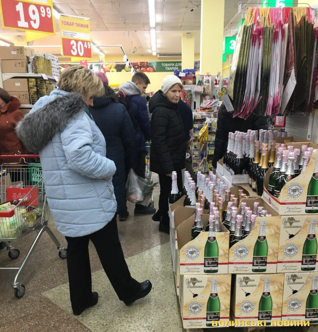І хоча кожен прийшов до магазину за чимось своїм, дехто – далеко не вперше, вчергове повертаючись за забутим, є те, що об’єднує усіх у святковій метушні, – пляшка шампанського в корзині чи візку.