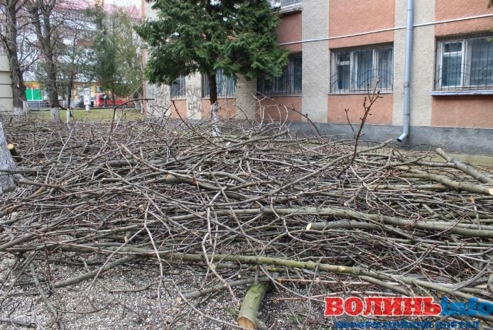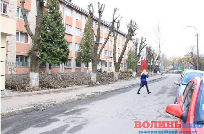 На вулиці Винниченка дерева біля гуртожитку № 2 Східноєвропейського національного університету імені Лесі Українки покронували дерева. Обрізали не лише дрібні гілки, а й взагалі всю крону. Лишили лише стовбури.