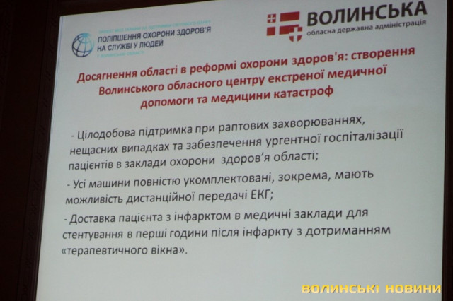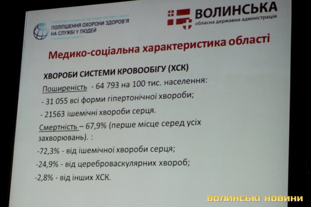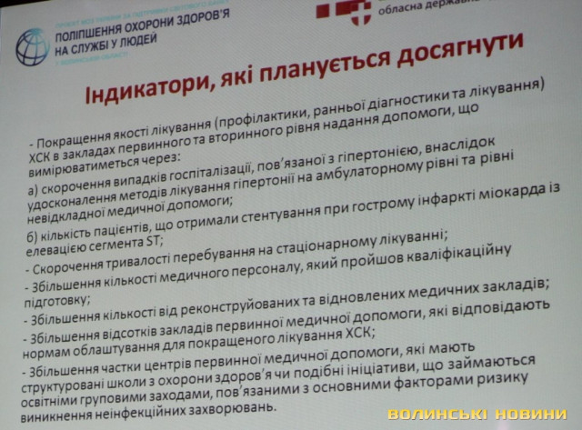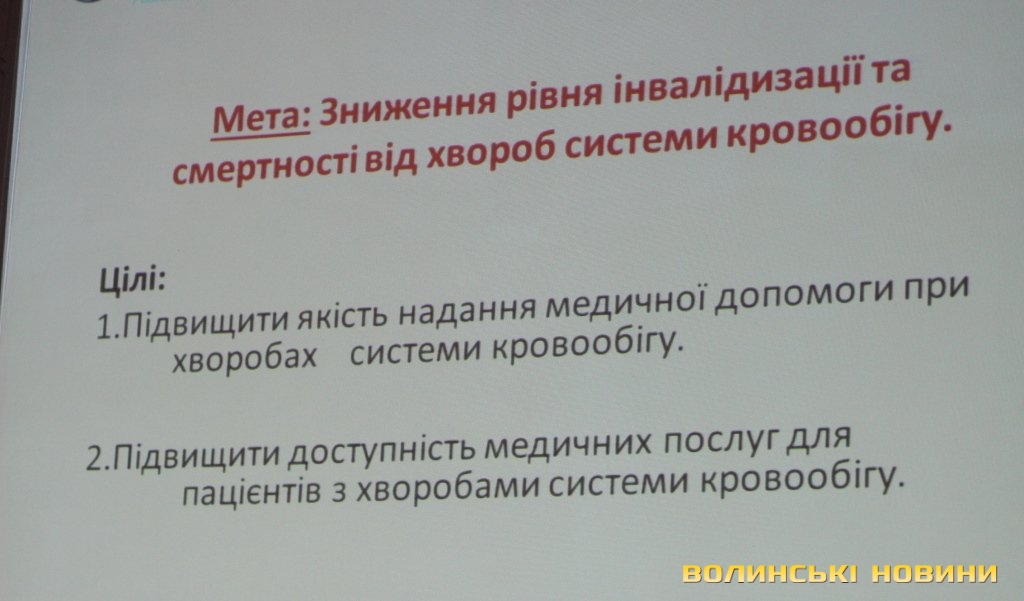 Для проекту на Волині обради напрямок вдосконалення медичної допомоги хворим на хвороби системи кровообігу, які становлять 68% причин смертності. Наразі в області відпрацьовані маршрути пацієнтів. Йдеться про службу екстреної медичної допомоги – усі машини мають можливість дистанційно передавати кардіограми. Зараз майже 100 тисяч кардіограм перебувають в базі даних обласного центру медицини катастроф. Мають відпрацьовану схему госпіталізації пацієнтів з інфарктом міокарда, хоча у цьому напрямку дуже стримує низьке забезпечення фінансовим ресурсом. У рамках субпроекту хочуть досягти збільшення кількості пацієнтів, які отримали стентування при гострому інфаркті міокарда. Також планують досягти скорочення тривалості перебування пацієнтів на стаціонарному лікуванні.