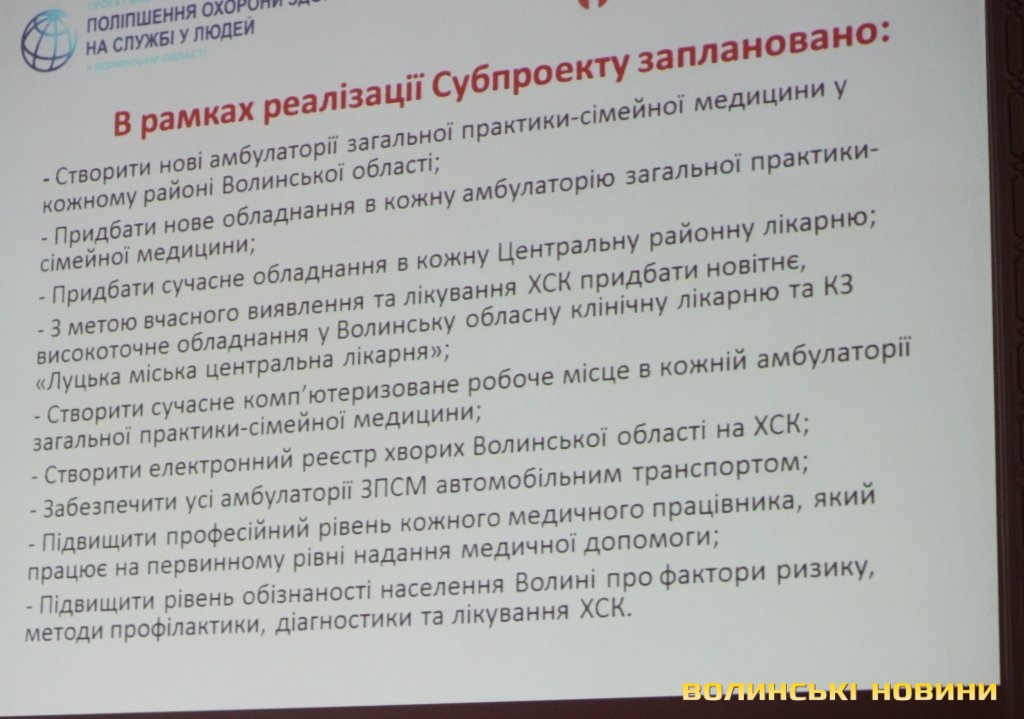Серед основних заходів, які планують здійснити у рамках субпроекту – створення нових амбулаторій загальної практики-сімейної медицини в кожному районі області, придбання нового обладнання для кожної з нових та вже існуючих амбулаторій, а також центральних районних лікарень. Окрім цього, чотири міжрайонні відділення, які планують створити, будуть оснащені на вищому рівні, ніж ЦРЛ. Також новітнє високоточне обладнання повинні придбати для Волинської обласної клінічної лікарні та Луцької міської клінічної лікарні. Планується, що мінімум вдвічі-втричі збільшиться кількість кардіохірургічних втручань, адже, якщо відбуватиметься оплата за надані послуги, заклади третинного рівня повинні будуть надавати послуги високого класу і прості хірургічні втручання відбуватимуться в лікарнях нижчого рівня.