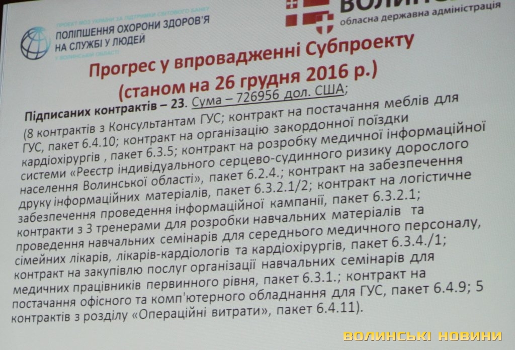 Наразі підписали 23 контракти на загальну суму 726 тисяч доларів, серед них – контракт на розробку медичної інформаційної системи «Реєстр індивідуального серцево-судинного ризику дорослого населення Волинської області».