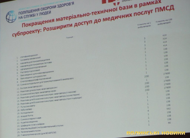 Начальник управління охорони здоров’я облдержадміністрації Ігор Ващенюк розповів, що проект писали ще у 2012 році. Був оголошений конкурс, де у першому етапі відібрали 11 областей, а потім 8 з них отримали схвалення Міністерства охорони здоров’я. Вони мають великі проекти – так, Волинь отримає 30 мільйонів доларів кредитних коштів, окрім цього, субпроект співфінансуватимуть з обласного бюджету. Кредит брала Україна на пільгових умовах, а в область гроші надходитимуть як бюджетні кошти.