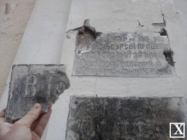 Цікаво, що розташована нижче меморіальна дошка, яка розповідає про встановлення радянської влади в Луцьку, ціла.