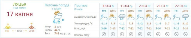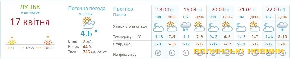 Зокрема у Луцьку 18 квітня очікується вночі -1..-3 градуси, вдень +7..+9. 19 квітня синоптики прогнозують дощ з мокрим снігом, температуру: від -1 до 1.