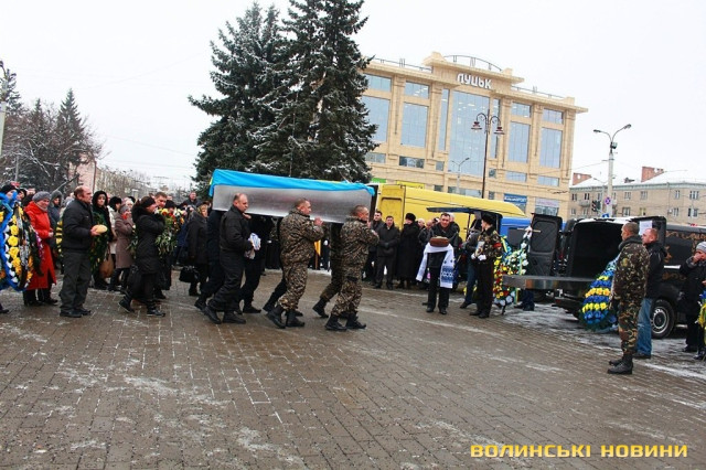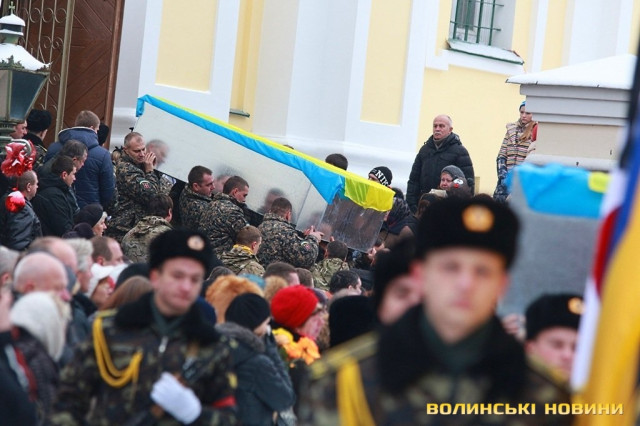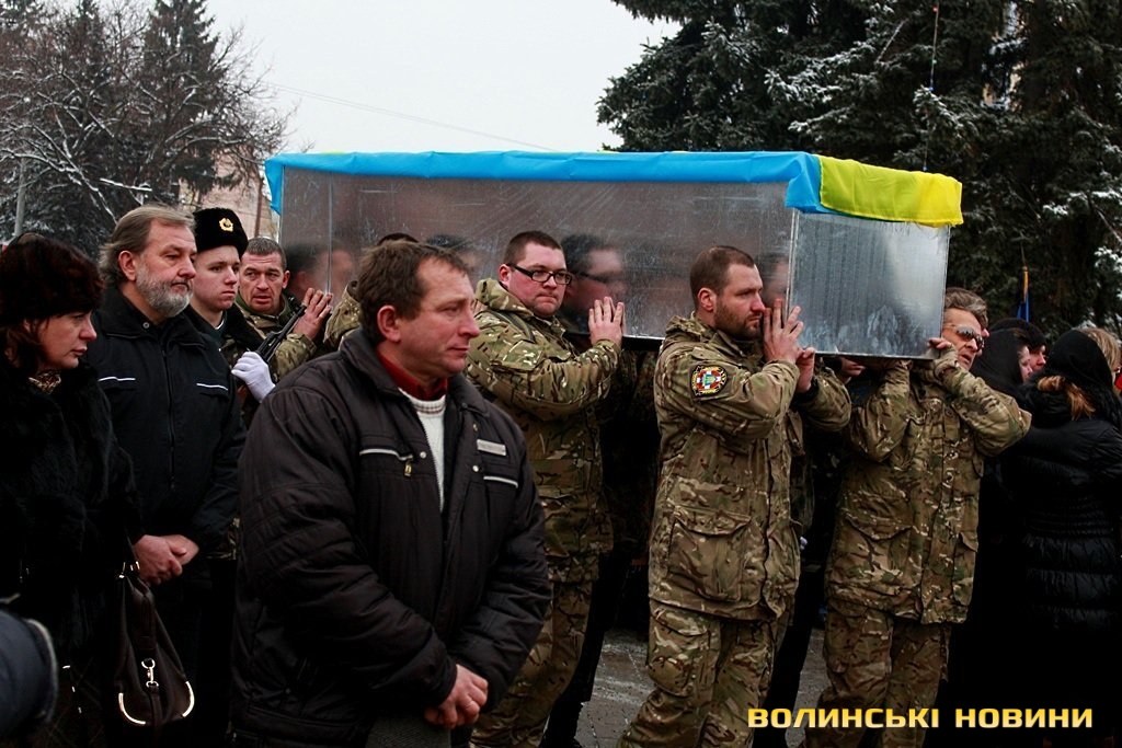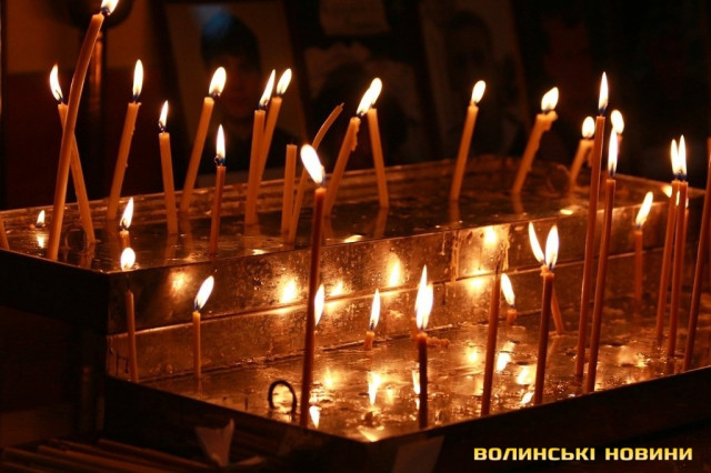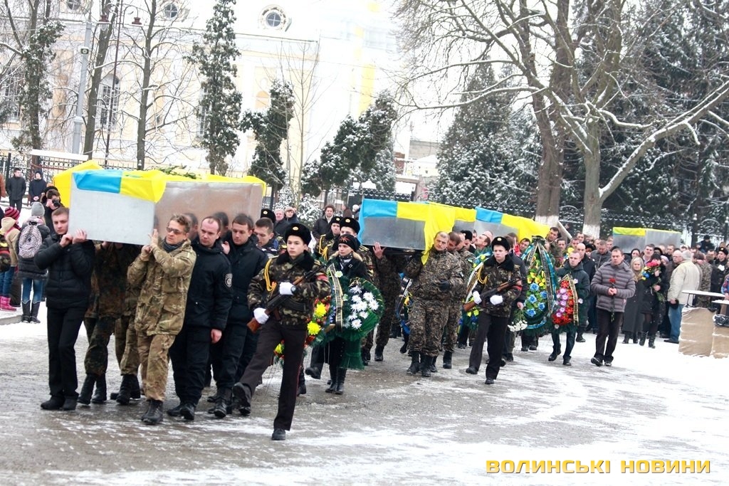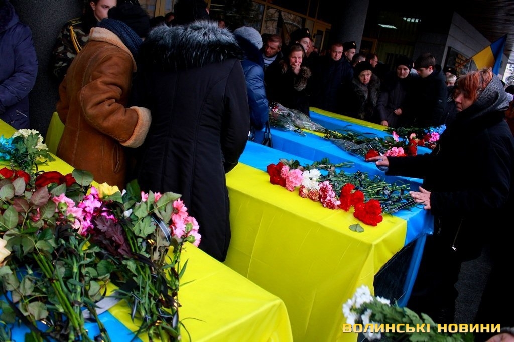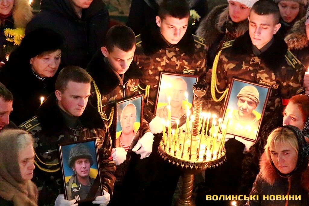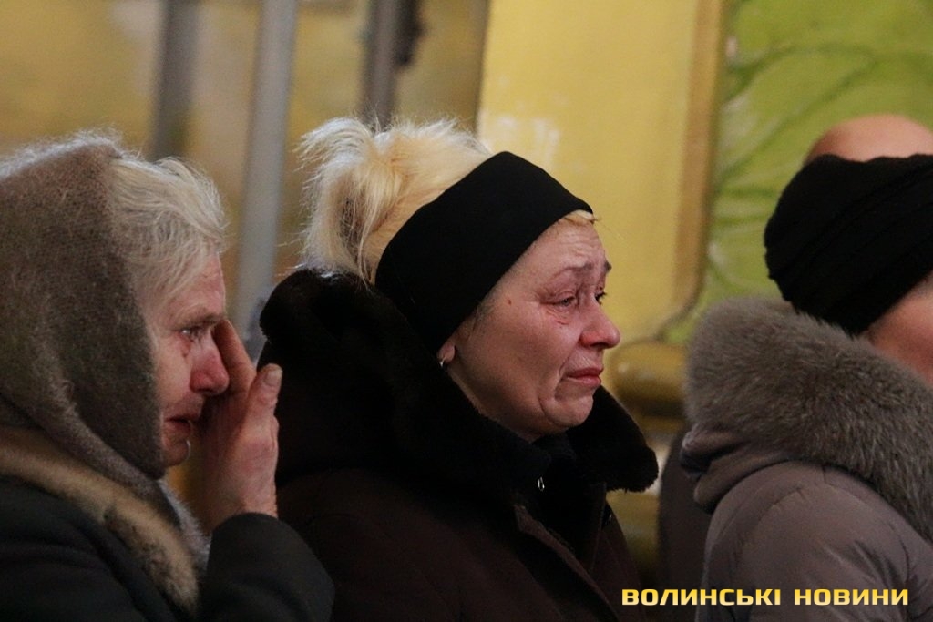Лучани ставлять свічки за упокій загиблих ГероївВажкі цинкові труни внесли до храму Гіркі сльози втрати та відчаюДвоє із загиблих воїнів так і не встигли стати на рушничок щастяРідні загиблих тримаються, як можутьУ Луцькому Свято-Троїцькому Соборі ніде яблуку було впастиСацюк Олександр (позивний «Білий»)Фельдшер роти рядовий міліції Олександр СивийСергій Помінкевич (позивний «Чех»)Шолуха Віктор (позивний «Шериф»)Представники Самооборони ВолиньЩира молитва за упокійЛяшук Максим (позивний «Яр»)