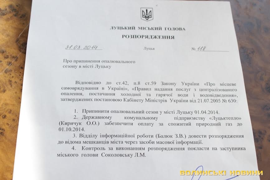 «Відповідно до ст.42, п.8 ст.59 Закону України «Про місцеве самоврядування в Україні», «Правил надання послуг з централізованого опалення, постачання холодної та гарячої води і водовідведення», затверджених постановою Кабінету Міністрів України від 21.07.2005 № 630, припинити опалювальний сезон в місті Луцьку 07.04.2014 року», - йдеться в документі.