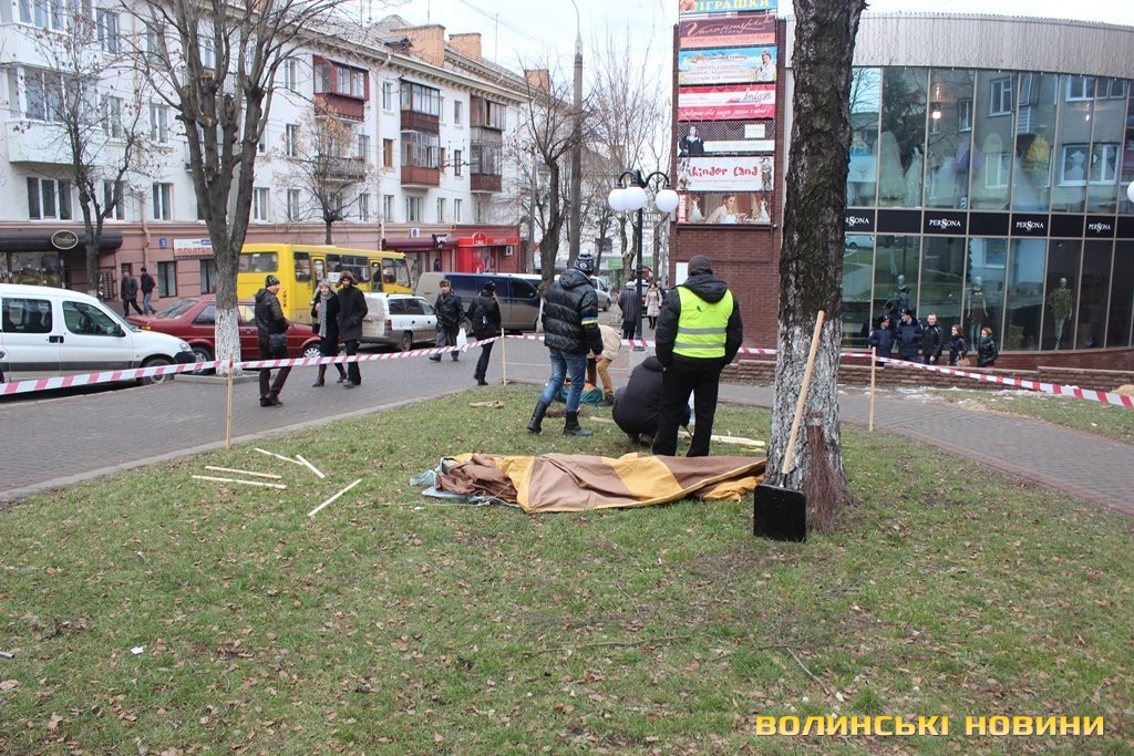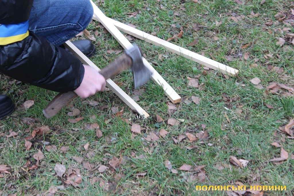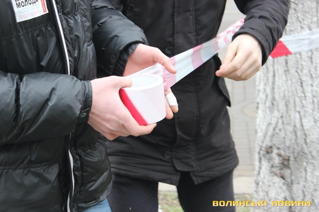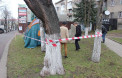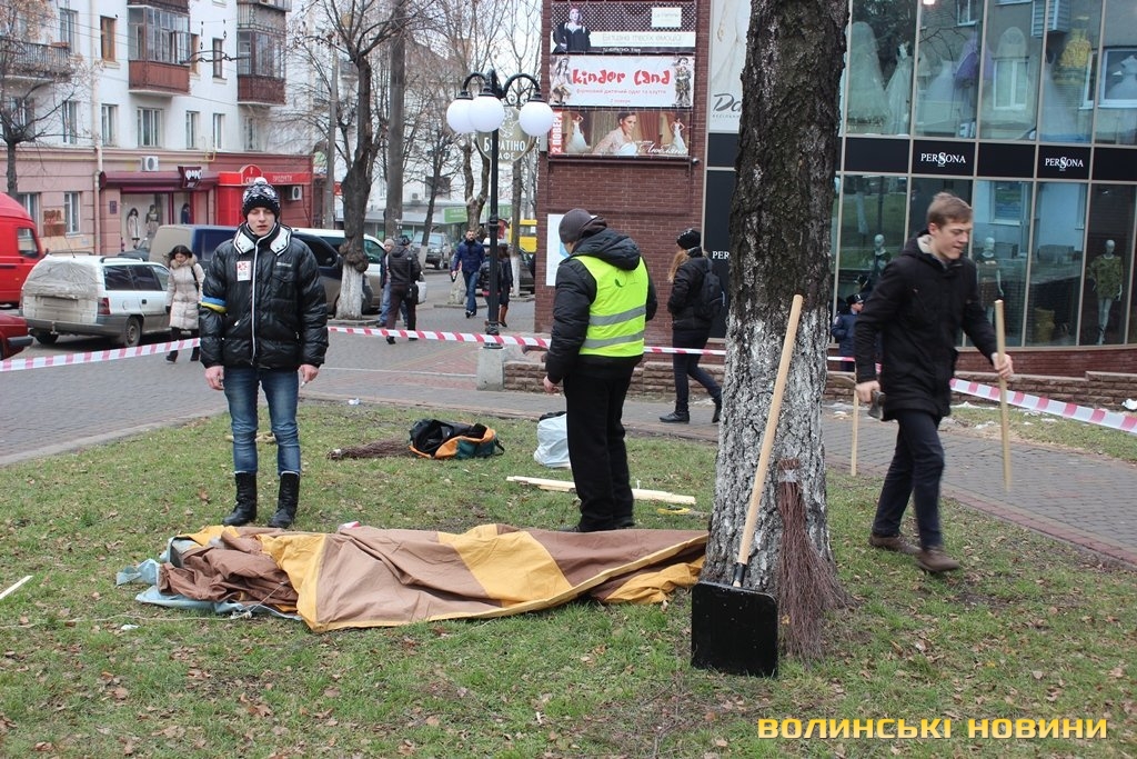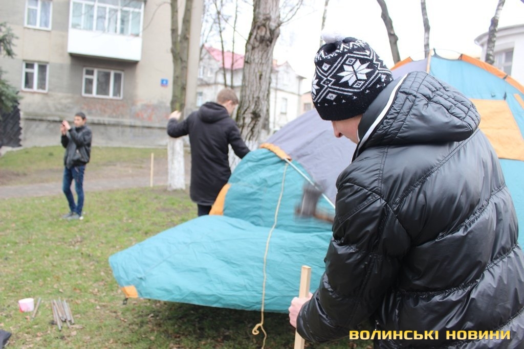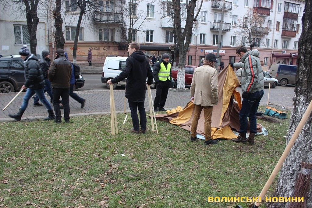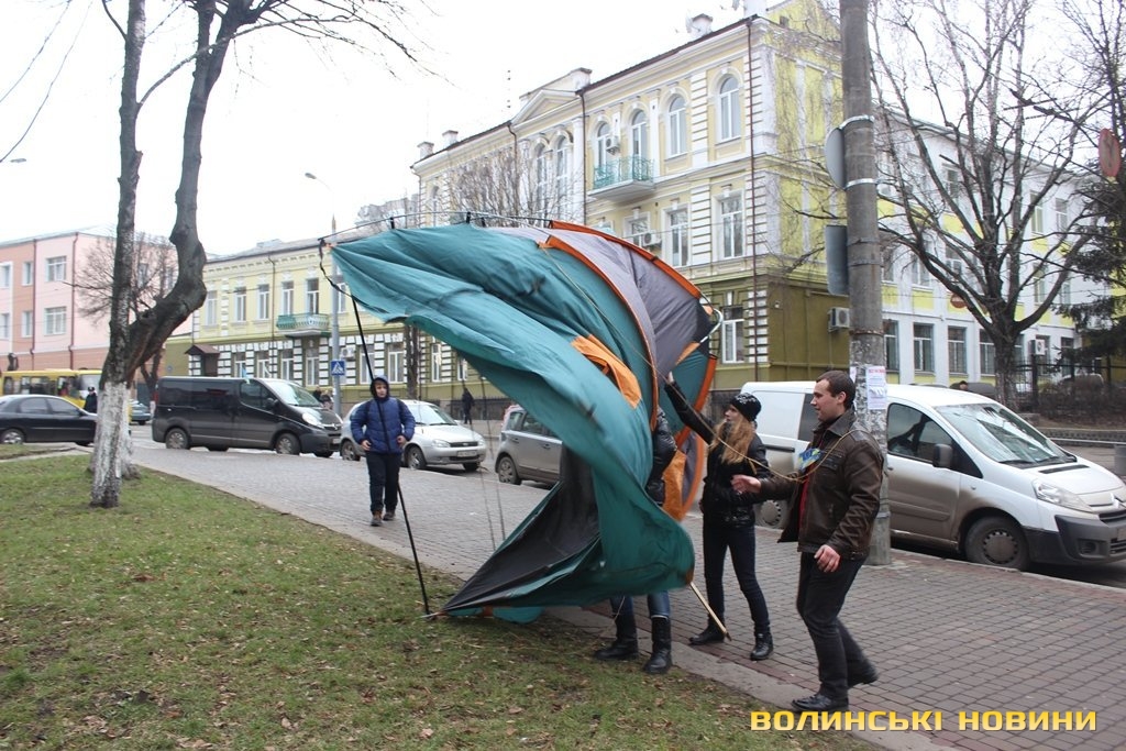 Громадські активісти зводять наметове містечко на вулиці Винниченка навпроти прокуратури у Луцьку, вимагаючи від правоохоронців відпустити політв’язнів.