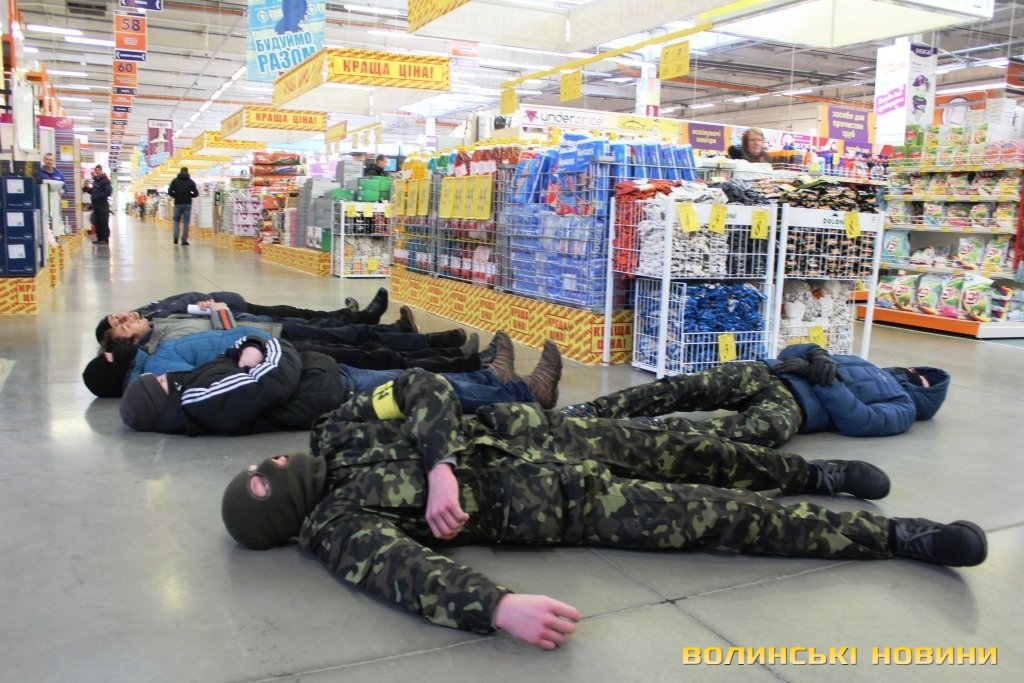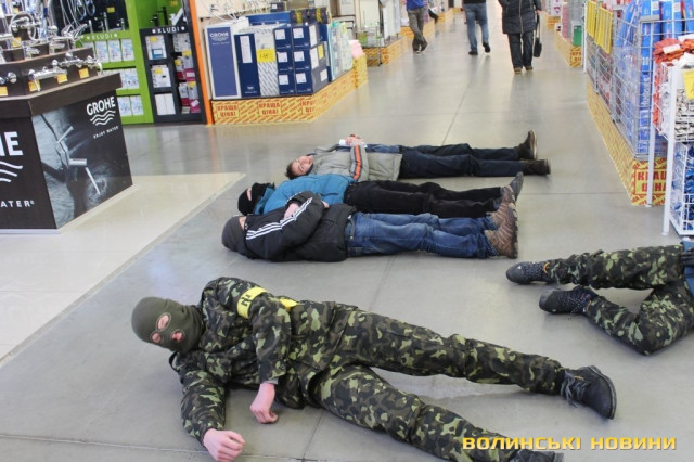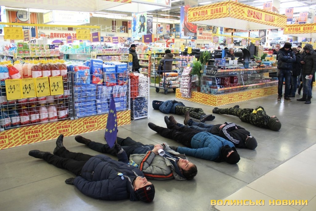 О 12.30 декілька активістів влаштували флешмоб у приміщенні гіпермаркету – вони впали на підлогу та лежали протягом однієї хвилини. Це символізувало те, що за гроші «Епійентру» вбивають людей.