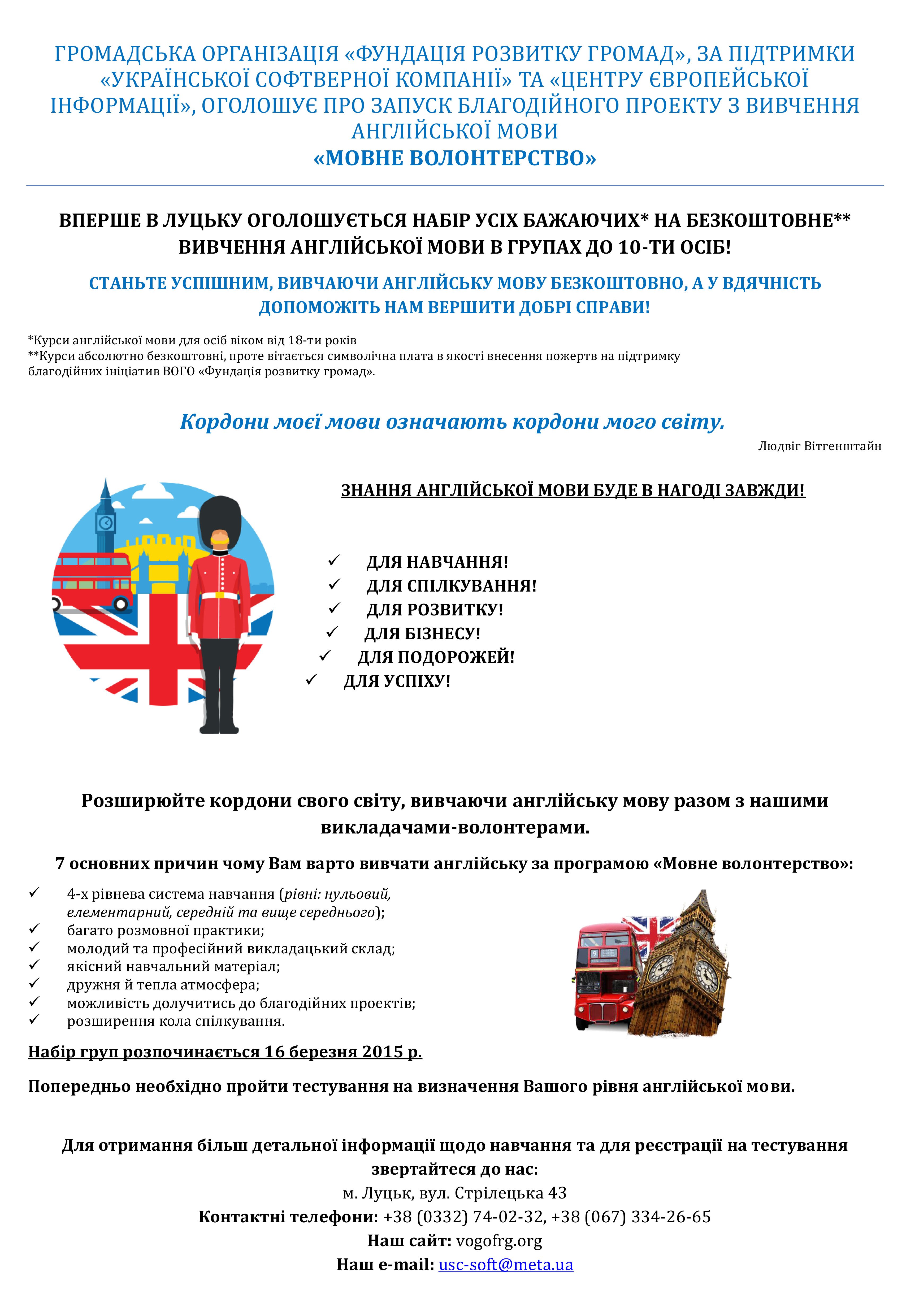 Безкоштовні курси вивчення англійської мови або мовне волонтерство організовують у Луцьку з 1 квітня, – інформують ініціатори заходу – Волинська обласна громадська організація «Фундація розвитку громад» та ДП «Волинська сортова компанія». Курси започатковують за підтримки Волинської бібліотеки імені Олени Пчілки.