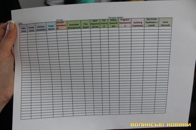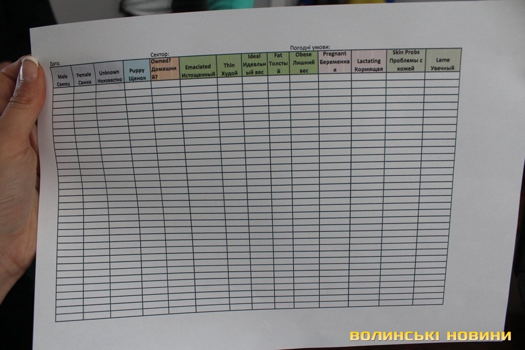 «Карту Луцька ділять на сектори, забарвлені у чотири кольори.Згідно із методикою, підрахунок охоплює 25% міста, але ми будемо рахувати цілих 50%. Це -19 районів, які треба обійти за дві години. У кожному із них працюватиме двоє студентів і закріплений за ними волонтер. Вони рахуватимуть песиків, яких бачать на вулицях. Один вноситиме дані в анкету, а інший - фотографує на смартфон кожну собачку і робить відповідну відмітку у спеціальній програмі на телефоні.Також в анкету вносять інформацію про стан шкіри тваринки, худа вона чи товста, визначають стать, якщо це можливо. Опісля підбиваємо підсумки, згідно із якими, згодом виводиться спеціальна формула, яка враховує погодні умови, кількість жителів і ще певні особливі характеристики, що можуть повпливати на результати дослідження», - ділиться власним досвідом захисниця тварин.