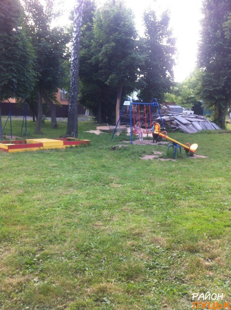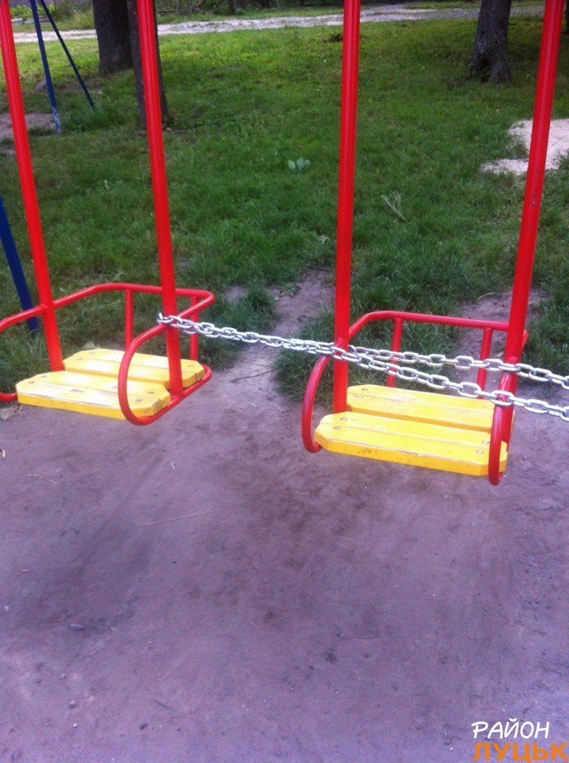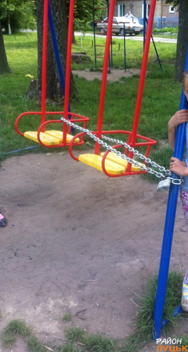 Діти, які живуть в прилеглих будинках, прийшли, як завжди, побавитись на невеличкому майданчику, встановленому недавно біля церкви благодійним Фондом Ігоря Палиці «Новий Луцьк», однак на гойдалках погойдатись вони не змогли, бо ті обкручені ланцюгом і закриті на замок.