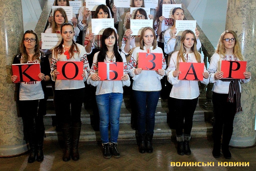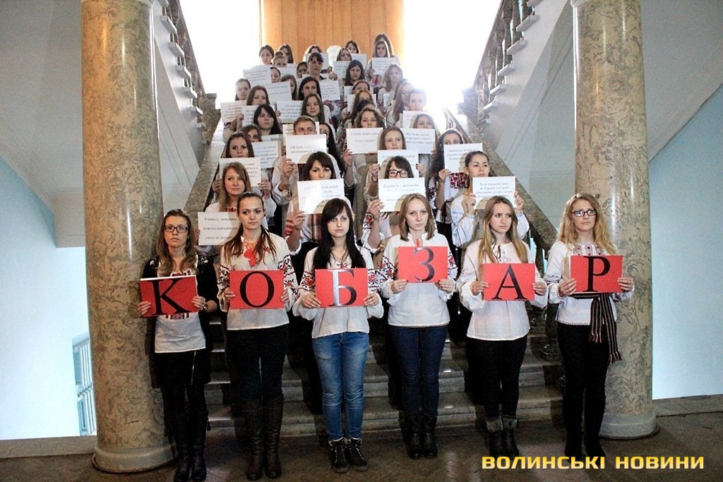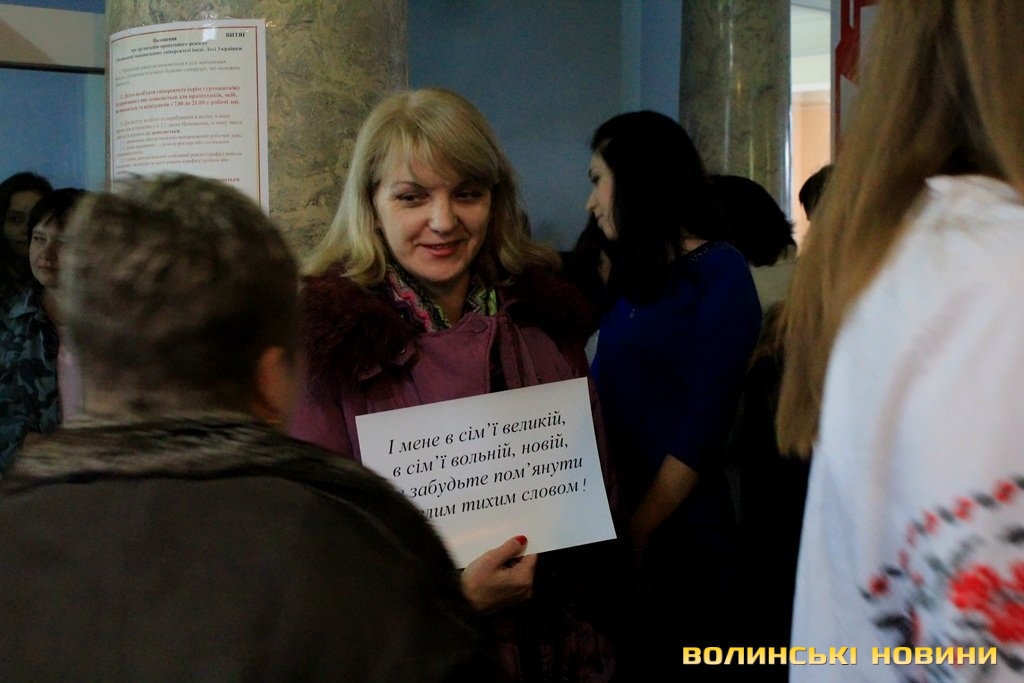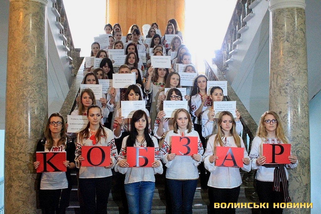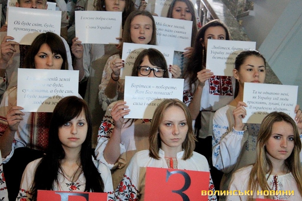 Флеш-моб із риторичною навою «Свою Україну любіть» організували луцькі студенти, аби нагадати лучанам про силу слова та великого Кобзаря. Захід присвятили до 200-річчя від дня народження Тараса Шевченка.