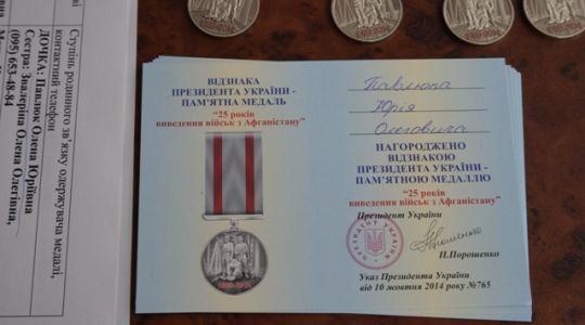 Вручення відзнак пам’ятних медалей «25 років виведення військ з Афганістану» учасникам бойових дій на території Республіки Афганістану у період 1979-1989 років та рідним тих воїнів-інтернаціоналістів, які вже пішли з життя, відбулося вчора, 21 квітня.