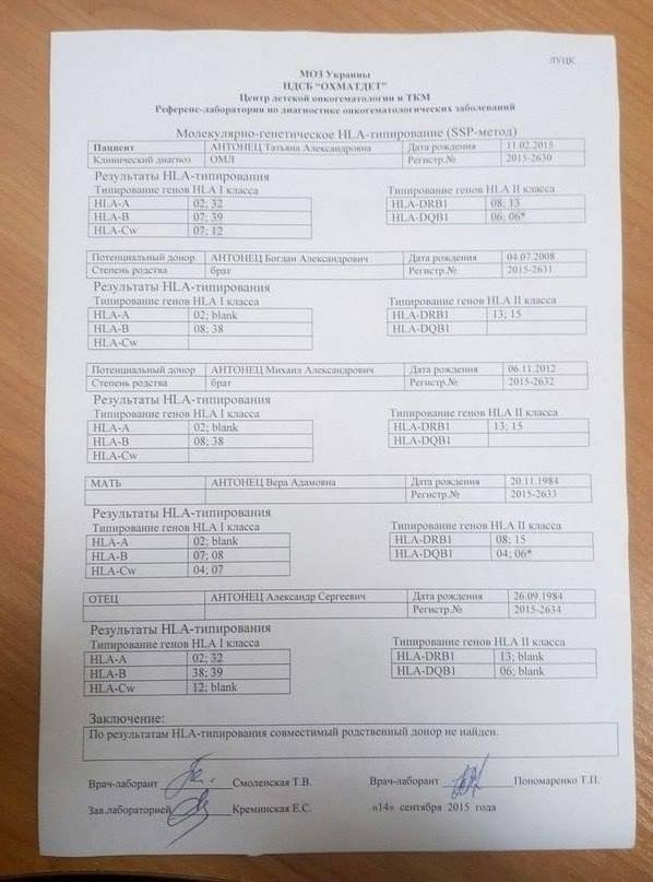 «Зараз дівчинка - у стані ремісії і у неї є всі шанси на одужання, та проблема як завжди в грошах, а також у рідкісній групі крові - 4+. За станом на сьогодні проведено з 6 блоків хімії - 3 блоки. Зі слів мами Танічка, 3-тій блок хімії перенесла, дякувати Богові - непогано. Мама Тетянки Віра перебуває чотири місяці в лікарні, приблизно ще стільки часу буде там же», - розповідає Андрій Білан.