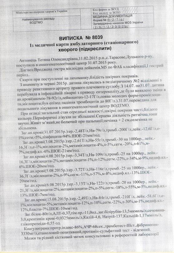 Як повідомляло Інформаційне агентство Волинські Новини раніше, маленькому янголяткові Тетянці Антонець - лише сім місяців, а вона вже бореться за своє життя.Лікарі поставили їй страшний діагноз - вроджена гостра мієлоідна лейкемія. Небайдужих волинян просять допомогти родині грошима та підтримкою. Окрім того, надалі потрібні донори для відбору тромбоконцентрату.