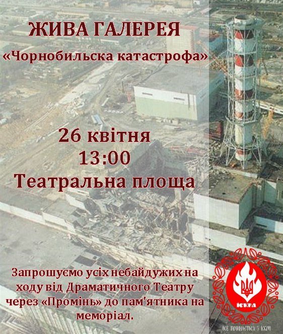 Традиційно в останні квітневі дні Україна та світ згадують жертв однієї з найбільших трагедій світового масштабу, спричиненої вибухом четвертого енергоблоку Чорнобильської атомної електростанції в ніч на 26 квітня 1986 року. У суботу, 26 квітня, о 13.00 на Театральному майдані відбудеться флешмоб в рамках вшанування пам’яті жертв аварії на Чорнобильській АЕС.