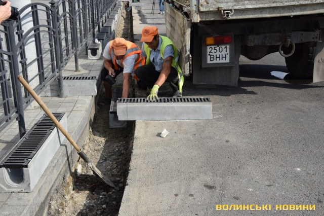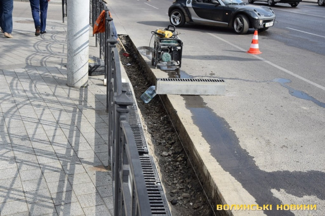 А в центрі міста, біля універмагу, облаштовують нову систему водовідведення. Потреба у даних роботах пов’язана із виникненням калюж у дощову погону в зоні центрального пішохідного переходу. Тепер цю проблему буде усунуто.