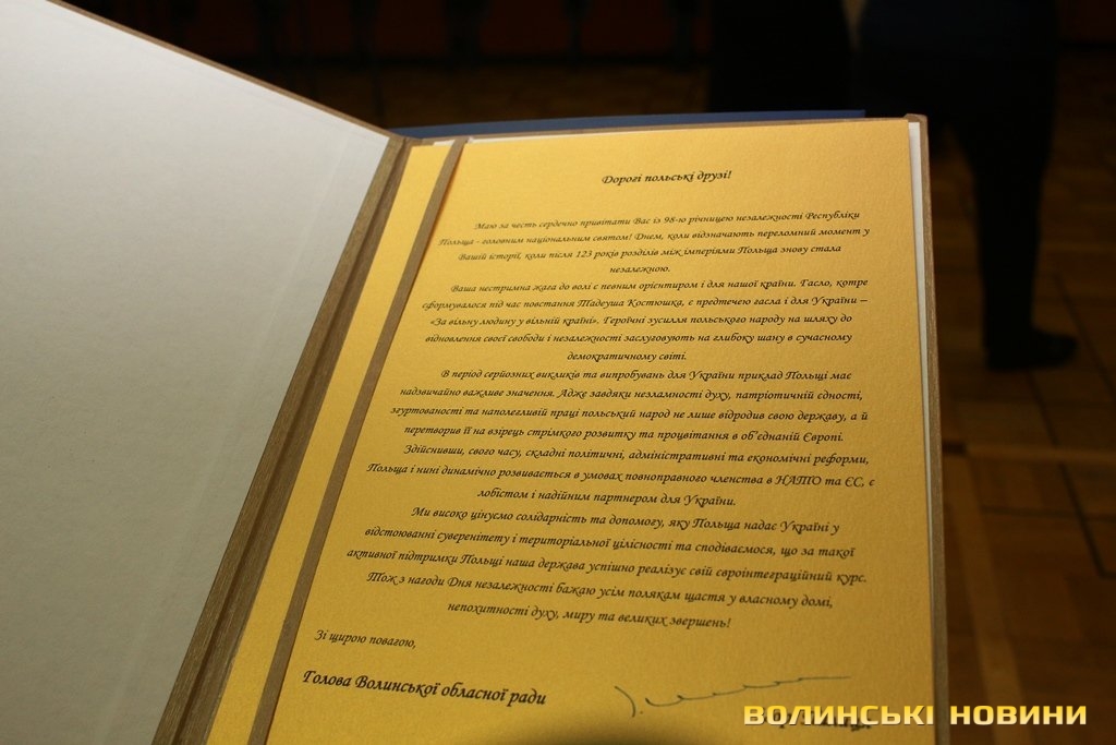 «В момент, коли патріотизм змінюється в ідеологію, яка стоїть понад законом і передбачає занедбання моральних та етичних норм, тоді згасає світло, стається трагедія. Занадто багато дала нам історія, щоб забувати про те, що у різноманітності традицій, які є нашою спадщиною, ми маємо вбачати багатство, а не загрозу», - додав консул.В залі, крім гостей з Польщі, були присутні і волинські науковці, громадські діячі та посадовці, які прийшли зі словами вітань. Отримали представники консульства і вітання з їхнім національним святом від голови облради Ігоря Палиці.