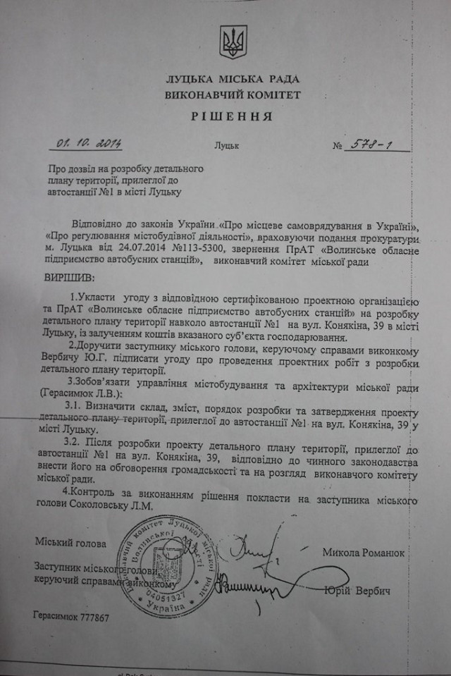 Зауважимо, що розробка має відбуватися із залученням коштів вказаного суб’єкта господарювання – автостанції.
