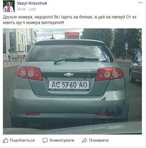 «Друкую номера, недорого! Всі їздять на бляхах, а цей на папері! От як мають круті номера виглядати!!!», - підписав світлину автор.