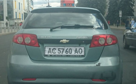 На фото – автомобіль Шевроле з паперовими номерами. Судячи з фішки на даху, водій працює у таксі.