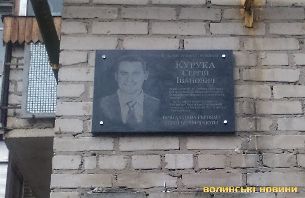 У Луцьку встановили меморіальну дошку ще одному Герою, який загинув під Іловайськом. Так, відтепер завжди усміхнене за життя обличчя лучанина Сергія Куруки дивитиметься на співвітчизників зі стіни його рідного будинку, що знаходиться по проспекту Соборності, 26.Нагадаємо, Сергій Курука народився 3 вересня 1987 року у Луцьку. Навчався у НВК № 26, професійно-технічному училищі № 9, Володимир-Волинському технікумі гідромеліорації. До призову працював у ТзОВ «Спайс-Луцьк».