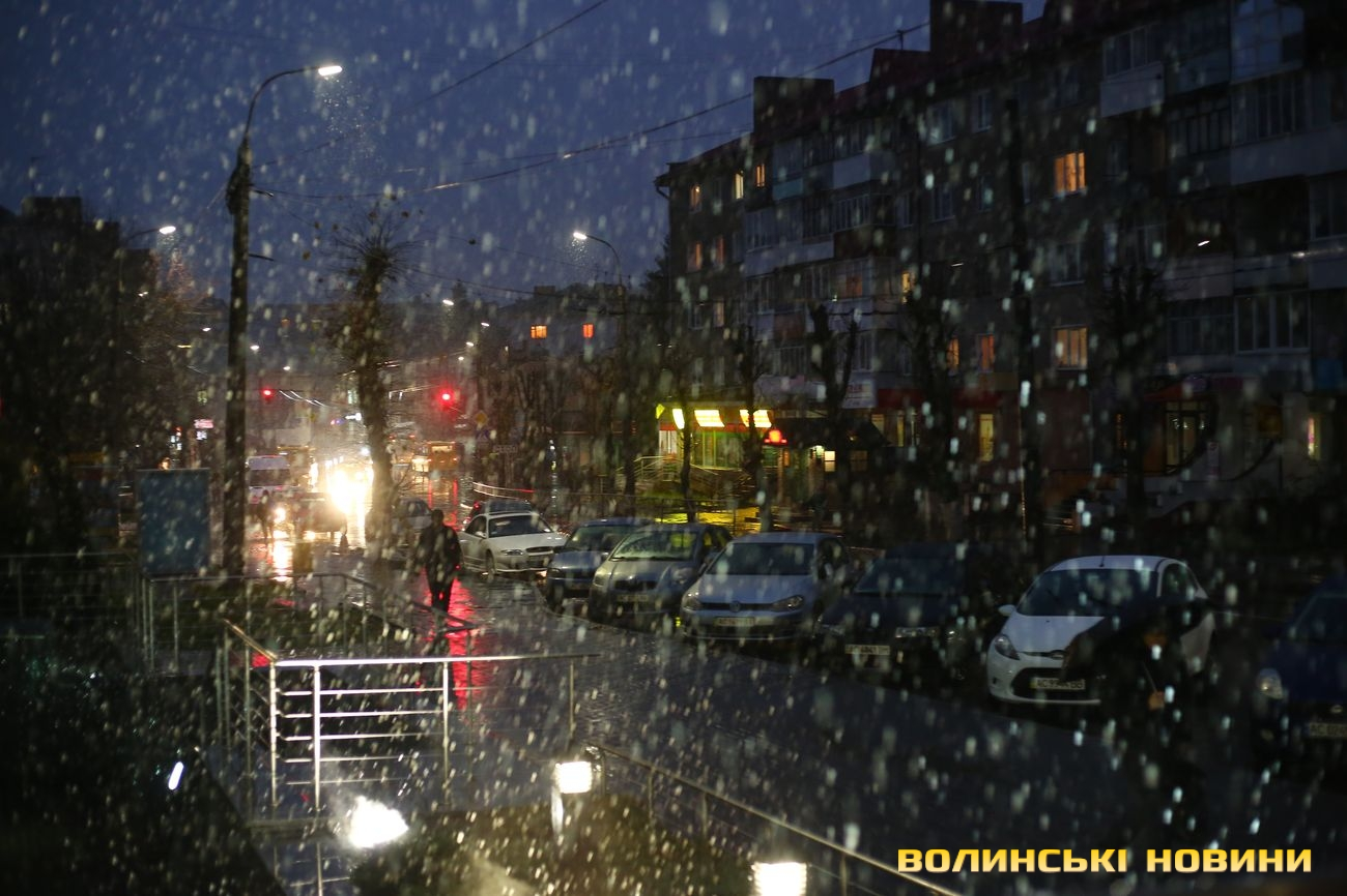 Зима все впевненіше стукає у двері лучан – сьогодні вечірній Луцьк накрив сніг.