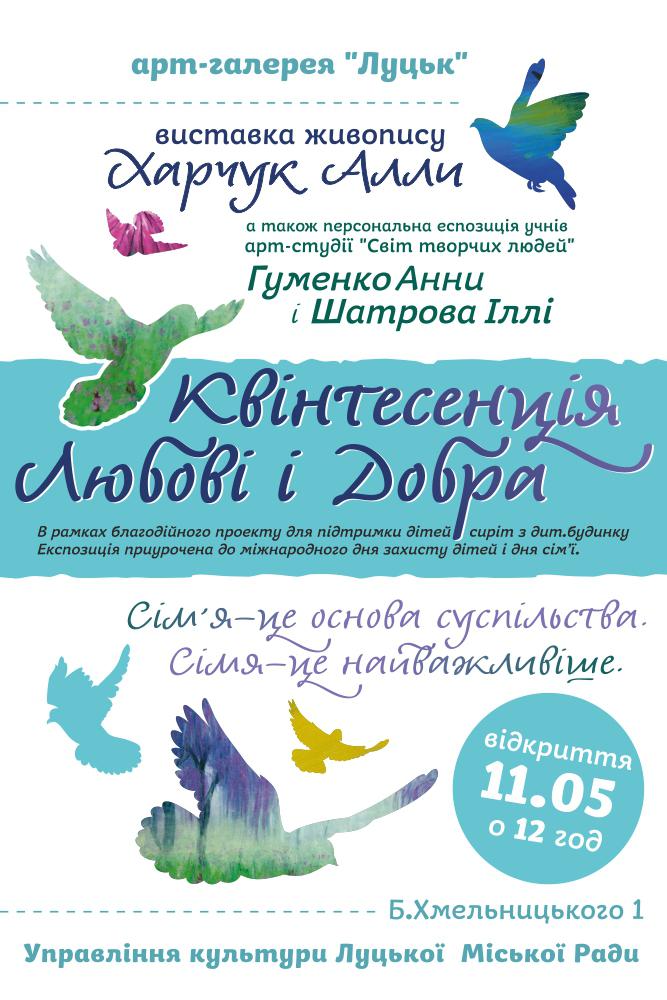Відкриття виставки живопису "Квінтесенція любові і добра" відбудеться 11 травня о 12:00 в арт-галереї "Луцьк", яка розташована за адресою Богдана Хмельницького, 1.