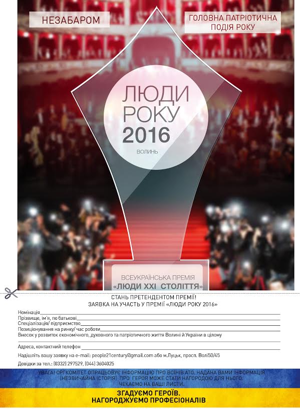 Головна патріотична подія —Премія «Люди Року-2016. Волинь» в рамках загальнонаціональної програми «Люди XXI століття» відбудеться 16 грудня у Луцьку.