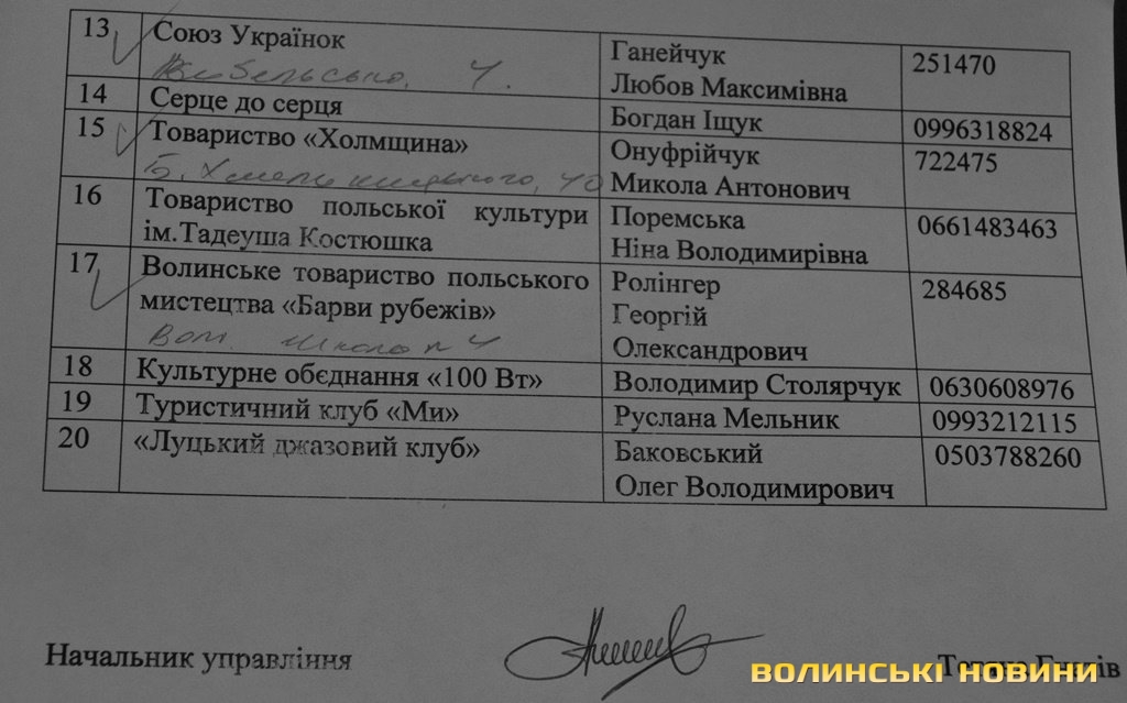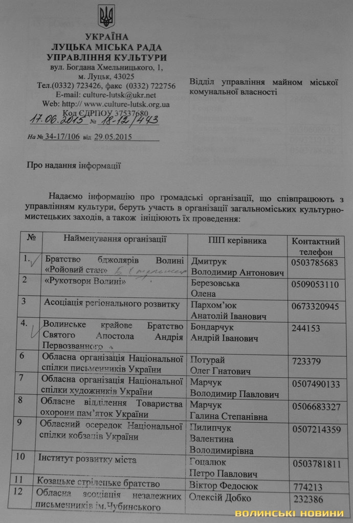 До пропонованого переліку входять: Братство бджолярів Волині «Ройовий стан», «Рукотвори Волині», Асоціація регіонального розвитку, Волинське крайове Братство Святого Апостола Андрія Первозванного, Обласна організація Національної спілки письменників України, Обласна організація Національної спілки художників України, Обласне відділення Товариства охорони пам’яток України, Обласний осередок Національної спілки кобзарів України, Інститут розвитку міста, Козацьке стрілецьке братство, Обласна асоціація незалежних письменників імені Чубинського, Союз Українок, Серце до серця, Товариство «Холмщина», Товариство польської культури імені Тадеуша Костюшка, Волинське товариство польського мистецтва «Барви рубежів», Культурне об’єднання «100 Вт», Туристичний клуб «Ми» та «Луцький джазовий клуб».