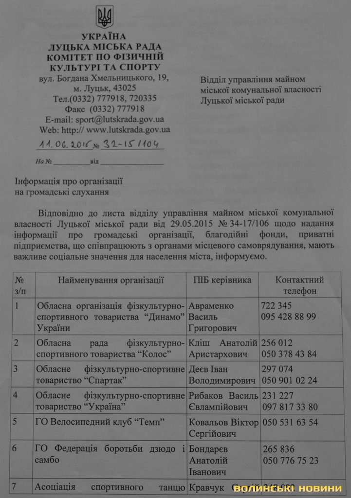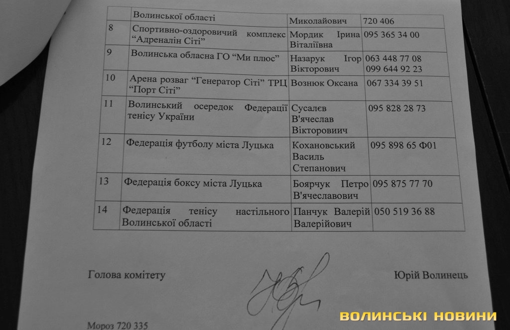Крім того, до списку громадських організацій, що мають важливе соціальне значення для населення міста потрапили: Обласна організація фізкультурно-спортивного товариства «Динамо» України, Обласна рада фізкультурно-спортивного товариства «Колос», Обласне фізкультурно-спортивне товариство «Спартак», Обласне фізкультурно-спортивне товариство «Україна», ГО Велосипедний клуб «Темп», ГО Федерація боротьби дзюдо і самбо, Асоціація спортивного танцю Волинської області, Спортивно-оздоровичий комплекс «Адреналін Сіті», Волинська обласна ГО «Ми плюс», Арена розваг «Генератор Сіті» ТРЦ «Порт Сіті», Волинський осередок Федерації тенісу України, Федерація футболу міста Луцька, Федерація боксу міста Луцька, а також Федерація тенісу настільного Волинської області.