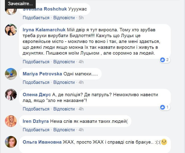 Зокрема, Ірина Каламарчук написала: «Кажуть, що Луцьк - європейське місто. Можливо, воно і так, але мені здається, що деякі люди, якщо можна їх так назвати, виросли і живуть у джунглях. Пишаюся моїм Луцьком, але соромно за людей».