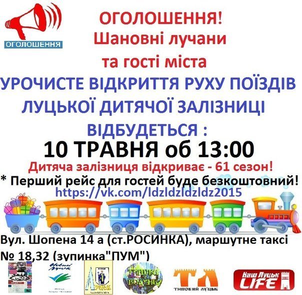 61 сезон відкриває дитяча залізниця у Луцьку. Урочисте відкриття відбудеться 10 травня о 13 годині.