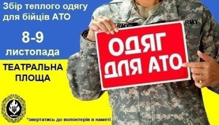 8 та 9 листопада, оголошується збір теплого одягу і речей, що можуть допомогти нашим захисникам, які перебувають в батальйонах «Київ – 2» та «ОУН».У зв1язку з похолоданням військовим терміново потрібні теплі речі та все, що може їх зігріти, зокрема: термобілизна, теплі шкарпетки ( в'язані або з інших теплозберігаючих матеріалів), ковдри, теплі светри, кофти флісові, теплі шапки, теплі рукавиці. Також необхідні старі мобільні телефони.