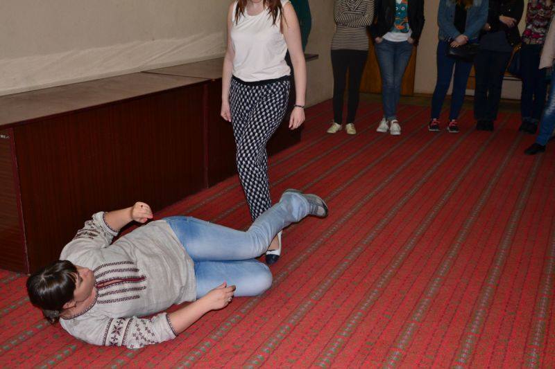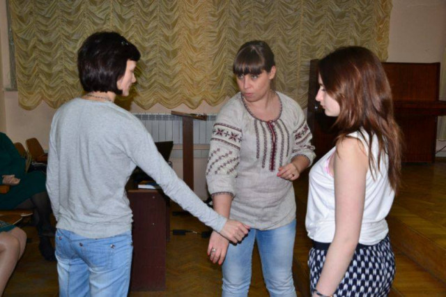 Також жінка-боєць показала, як можна захиститися звичайними підручними засобами – книгою, хустиною, ручкою, скріпкою тощо. Продемонструвала Олена й декілька больових прийомів, які кожна жінка без особливої фізичної підготовки зможе застосувати в цілях ефективної самооборони. Фото Жіночого клубу