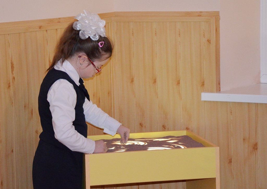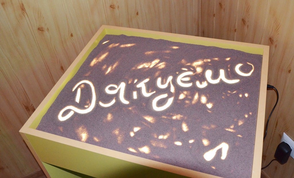 Стіл для малювання піском застосовують в арт-терапії. Сухий душ навчає сприймати простір. Пуфи-трансформери набувають форми тіла і сприяють емоційному розвантаженню. Панно «Зоряне небо» допомагає покращити зір, світильник з аналогічною назвою – зняти емоційну напругу. Світлодинамічний пристрій пришвидшує розвиток уваги. Ще в кімнаті є колона з бульбашками, соляна лампа, лава-лампа, світильник «Полум’я», пристрій для ароматерапії, іонізатор-очищувач повітря.