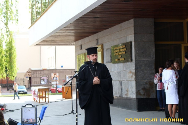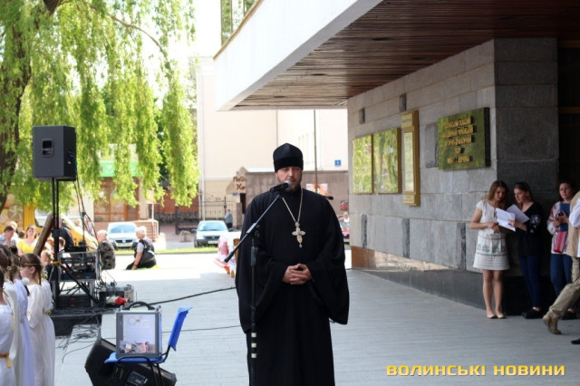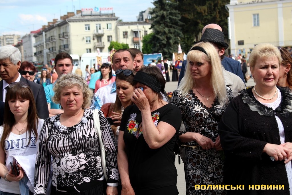 Він закликав жінок молитися за спокій душ загиблих, бути національно свідомими, пам’ятати, що хлопці загинули заради України, рідної землі. Священик наголосив, що люди, які забувають минуле, змушені переживати його повторення, адже хто не знає минулого, не вартий майбутнього. Він закликав присутніх ніколи не забувати національно свідомих вояків, які любили батьківщину, близьких та друзів, поклавши своє життя за них. Священик запевнив, що церква ніколи не забуває своїх героїв, а ті, хто боровся за Україну, завжди будуть на престолі Всевишнього.Представники духовенства передали матерям полеглих ікони Божої Матері, аби вона оберігала своєю благодаттю їхні родини.Пам'ять полеглих Героїв вшанували хвилиною мовчання. Після цього кожного загиблого на сході лучанина згадали поіменно, випускаючи в небо сині та жовті повітряні кульки із жалобними стрічками. Завершився захід покладанням квітів до стенду з портретами Героїв. Матері не могли стримати сліз, віддаючи останню шану загиблим на війні синам.