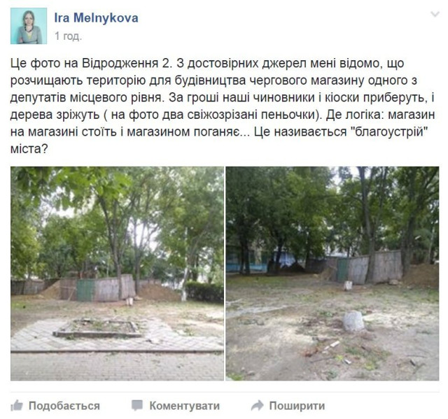 «Це фото на Відродження, 2. З достовірних джерел мені відомо, що розчищають територію для будівництва чергового магазину одного з депутатів місцевого рівня. За гроші наші чиновники і кіоски приберуть, і дерева зріжуть ( на фото два свіжозрізані пеньочки). Де логіка: магазин на магазині стоїть і магазином поганяє... Це називається "благоустрій" міста?», - йдеться у дописі лучанки.Нагадаємо, у Луцьку за зелені насадження почалася справжня «війна». Так, декілька тижнів тому комунальники зрізали цілком здорові дерева на вулиці Лесі Українки. Мотивували вони це тим, що має відбутися реконструкція вулиці, а для цього її треба зачистити від зелених насаджень.
