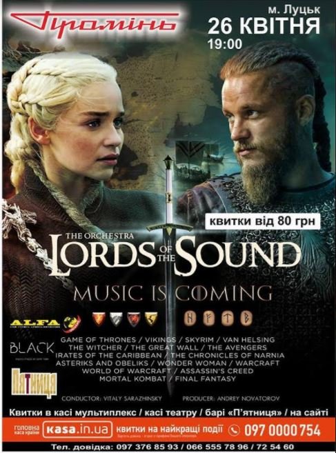 Хіти з відоміших фільмів, коміксів та ігор звучатимуть у Луцьку у виконання київського симфонічного оркестру Lords of the Sound. Концерт відбудеться 26 квітня о 19.00 у РЦ «Промінь».