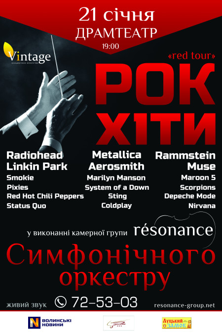 Лучани мають змогу послухати підбірку відомих рок-хітів у виконанні симфонічного оркестру «Résonance». Концерт відбудеться у приміщені облмуздрамтеатру 21 січня о 19 годині, - повідомляють організатори.