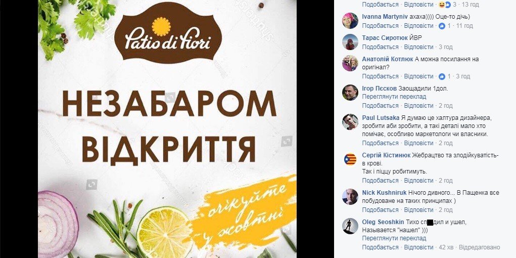 «Особливості волинського дизайну — спи*дити фотку і не витерти копірайти шатера. P.S. Трохи х**овий старт для такого ніби пафосного закладу, як Patio di fiori», - йдеться у дописі.Такий ляп на світлині викликав жваву реакцію користувачів. Помітивши промах дизайнера та прочитавши реакцію у мережі, власники ресторану високої кухні вирішили видалити фото, але обговорення ляпу продовжується.«Понти в селі - велике діло», - пише Malva Olena.